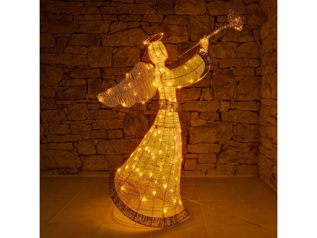 Elegantní vánoční anděl s výškou 122 cm pro vnitřní i venkovní použití. Osazen 120 LED diodami s příjemným teplým bílým světlem. Díky krytí IP44 je odolný vůči počasí. Součástí balení je bezpečný 24 V transformátor a napájecí kabel o délce 1,8 metru.